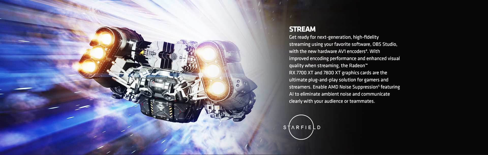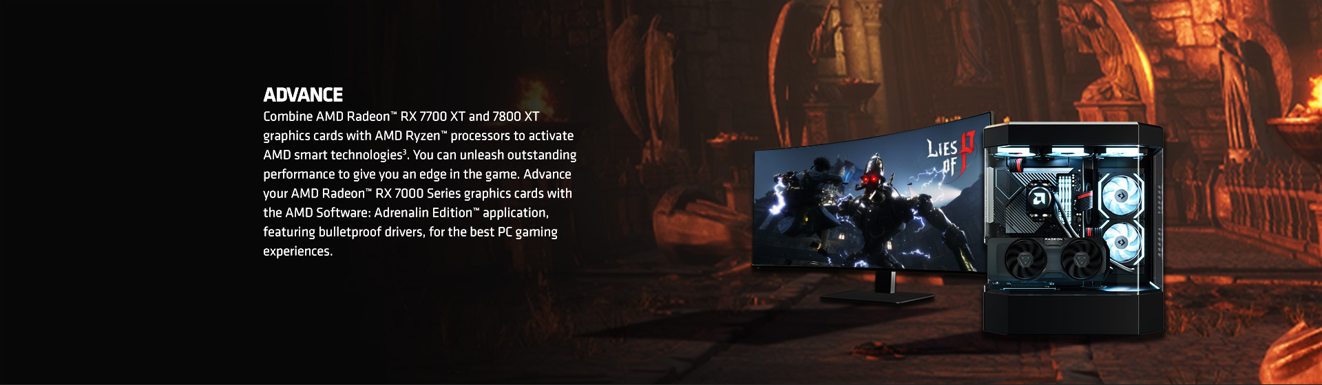 Experience unprecedented performance, visuals, and efficiency at 4K and beyond with AMD Radeon™ RX 7000 Series graphics cards, the world’s first gaming GPUs powered by AMD RDNA™ 3 chiplet technology. Immerse yourself in breathtaking visuals with the pinpoint color accuracy of AMD Radiance Display™ Engine and boost frame rates with AMD FidelityFX™ Super Resolution and Radeon™ Super Resolution upscaling technologies.1,2 To unlock even more performance, combine AMD Radeon™ RX 7000 Series graphics and compatible AMD Ryzen™ processors to activate AMD smart technologies.3