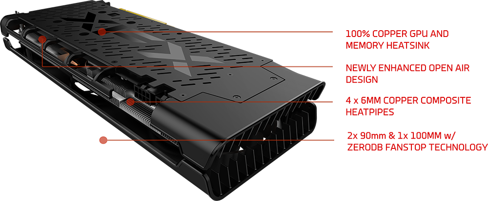 XFX fans are equipped to run at the highest possible performance, while our Zero DB Fan System will also keep your fans running at efficient RPM in order to minimize annoying fan noise by lowering RPM all the way down to Zero RPM. When the heat is on during intense gaming, our fans will speed up as needed.