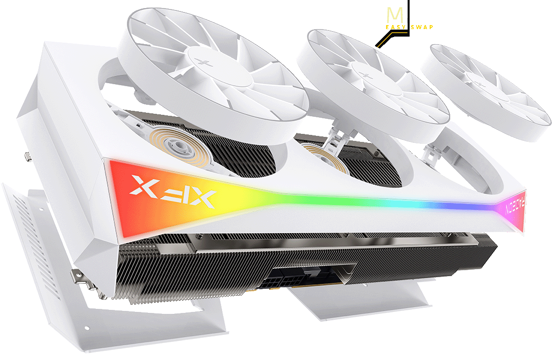 With each iteration of the XFX Mercury class, we try to simplify the design while also improving thermal performance. Our nickel-plated copper vapor chamber, double ball bearing fans, and 6mm heatpipes all come together to give amazing cooler performance and thermal dissipation.