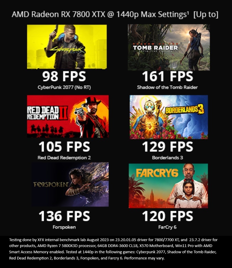 Experience incredible performance, visuals, and efficiency when gaming and streaming with the AMD Radeon™ RX 7700 XT and 7800 XT graphics cards, powered by the AMD RDNA™ 3 architecture. Immerse yourself in next-generation desktop experiences on some of the most advanced high refresh rate displays with up to 16GB of GDDR6 memory, new frame generation technologies, advanced raytracing, AI accelerators, AV1 encoding, and support for the latest DisplayPort™ 2.1 technology. The Radeon™ RX 7700 XT and 7800 XT delivers an incredible high refresh 1440p gaming & streaming experience, with additional video memory to step into 4K.
