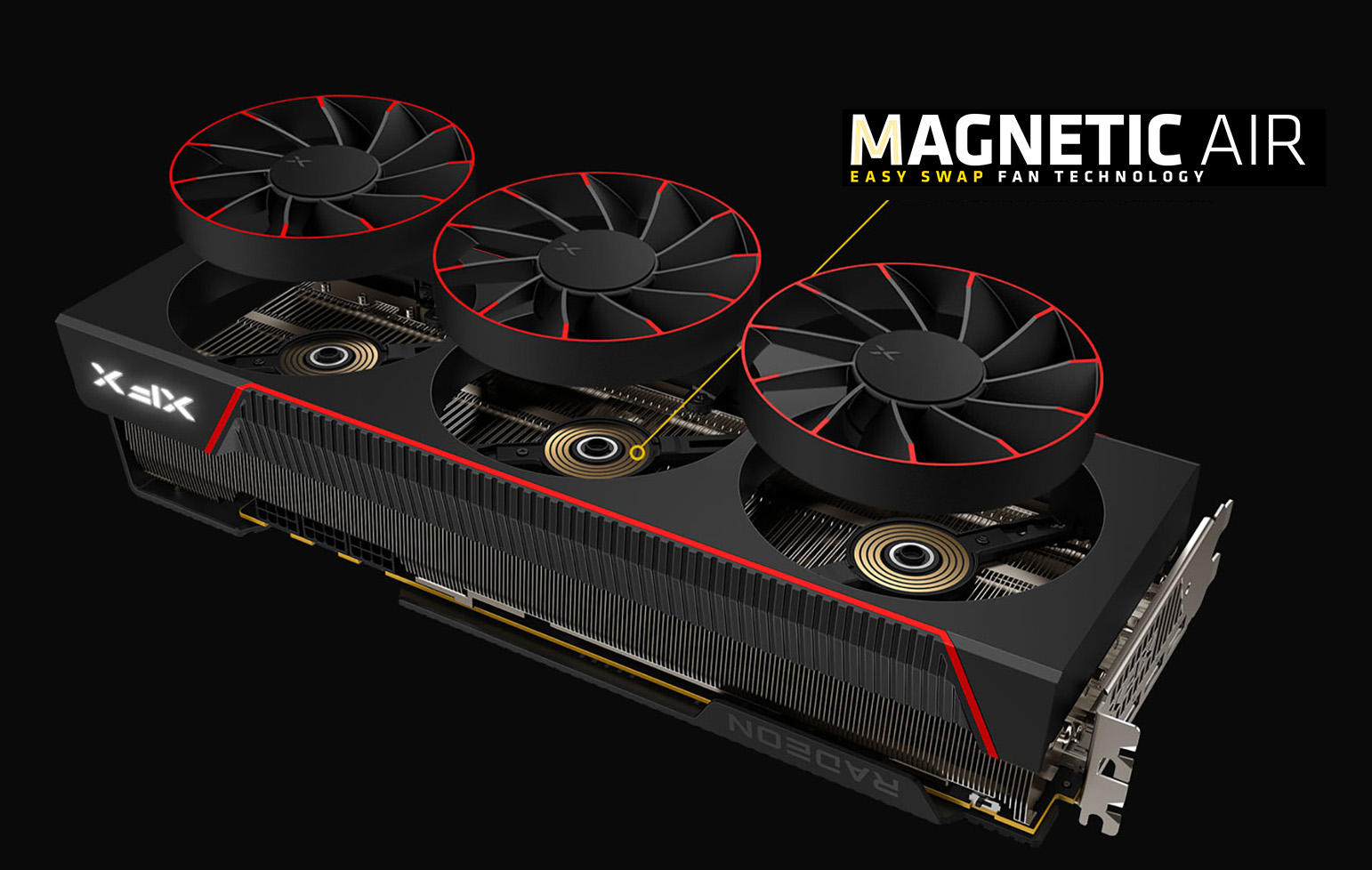 The all-new XFX Magnetic Air easy swap fan technology, the first of its kind thermal evolution lets you remove and replace fans instantly. No need for tools, or to even remove your GPU from the PC, just swap it in and out with no effort.