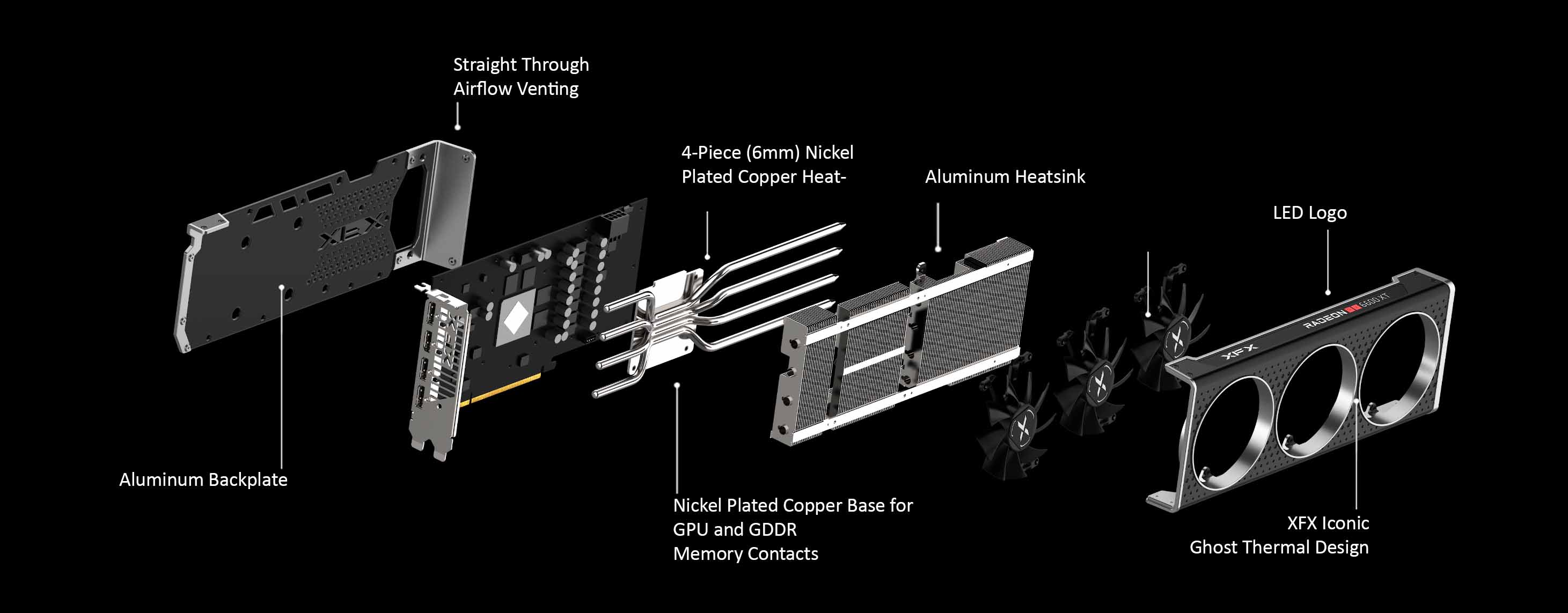 XFX's all new Ghost Thermal design cools your GPU better than ever before. Our new design features a straight through airflow venting to significantly improves cooling and compliments open design of the Ghost Thermal floating shroud design. Our 9 blade fans increase total air flow and provides long lasting quieter operation.