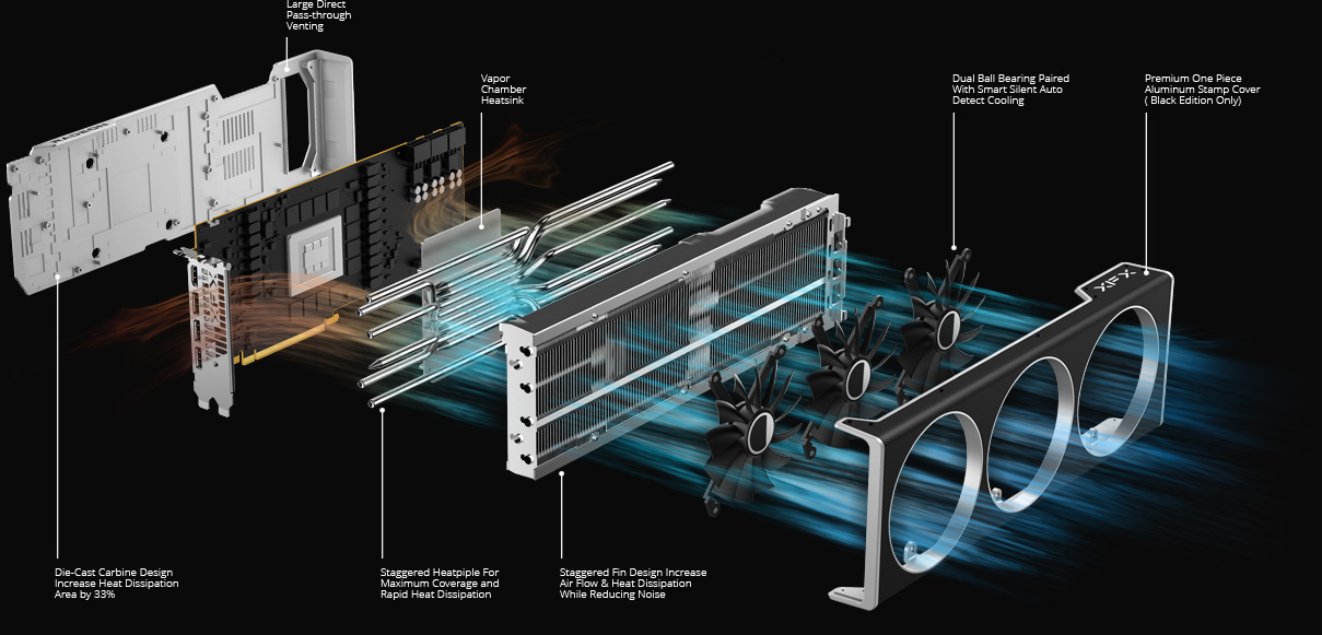 A 12+3+2 phase power design implements a large V-Core allowing it to provide you with stable gameplay, and giving better power distribution across the VRMs.. This allows the GPU to operate cooler at baseline but also have tremendous room to overclock thanks to XFX's increased power delivery BIOS.