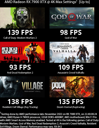Breakthrough new levels of performance with 24GB of GDDR6 memory and blazing fast clock speeds to deliver an incredible experience at 4K and beyond. Radeon™ RX 7900 Series graphics feature advanced AMD RDNA™ 3 compute units, with 2nd generation raytracing accelerators and new AI accelerators to deliver incredible performance while maximizing graphical fidelity.