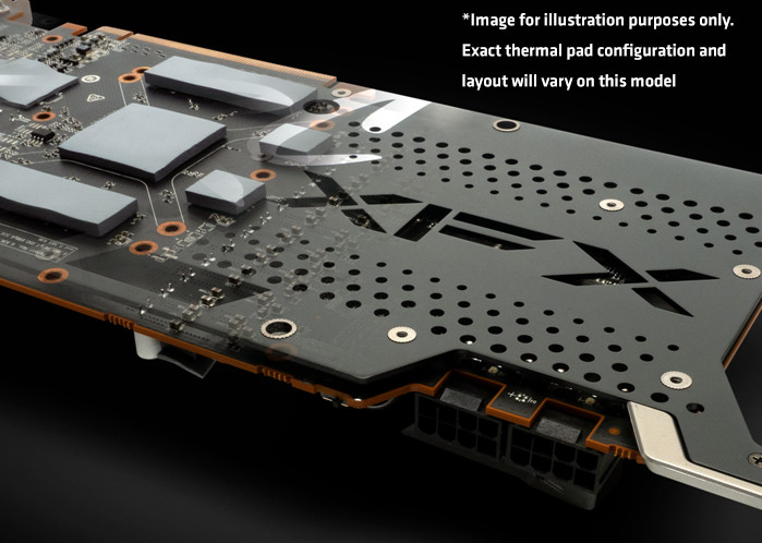 XFX maximizing the cooling effectiveness of our cards by increasing the number of thermal padding throughout the card. This includes thermal pads on VRM's, Memory, and GPU on both sides of the PCB. Ensuring stable high quality performance.