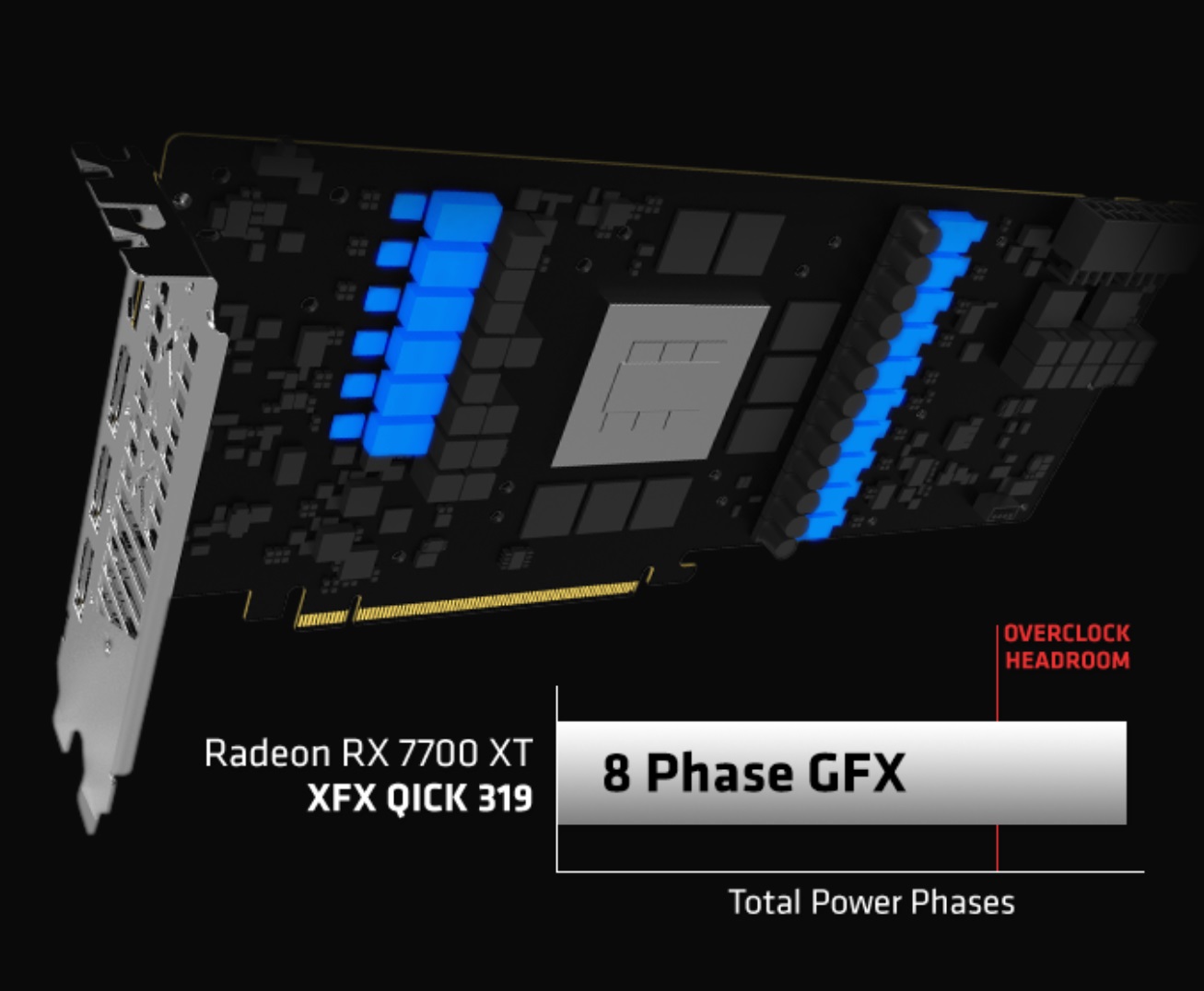 With a 14-phase power design, and a dedicated 8-phases for GPU GFX Core, the QICK 319 7800 XT provides you with stable gameplay and gives better power distribution across the VRMs. This allows the GPU to operate cooler at baseline but also has tremendous room to overclock thanks to XFX's increased power delivery BIOS.